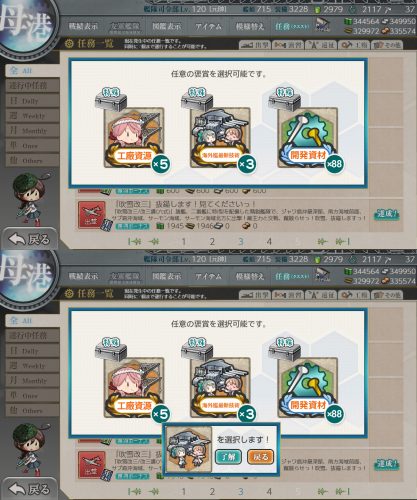 ※開発資材と高速建造材が不足している提督方、本日実装の新任務群で新たに選択獲得も可能です。